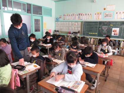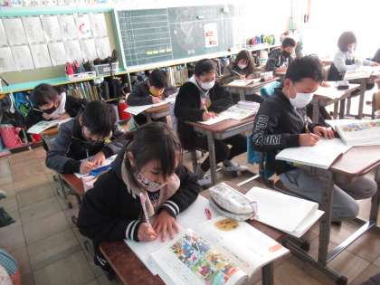 3年生の国語です。「漢字の広場6」で、既習の漢字を活用する学習をしていました。教科書にある絵の人になりきって、それぞれの季節でどんなことをしたのか、指定されている漢字を使って文を作っていました。春の楽しげな絵を見て、春が待ち遠しくなってしまいました。