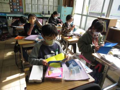4年生の図工です。「ゴー!ゴー!ドリームカー」という学習に入っています。こんな車があったらいいなあという車を作ります。車体の基本的な仕組みはできあがり、いよいよボディーを立体的な仕上げていきます。完成が楽しみです。