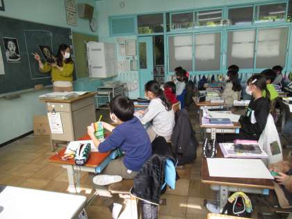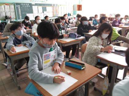 4年生の図工です。「ほってすって見つけて」という学習に入りました。彫刻刀で板をほります。つまり、版画です。「何かを食べている自分」という課題をもとに、下絵をかいていました。好きな食べものを思い浮かべているだけで、なんだかみんな楽しそうでした。