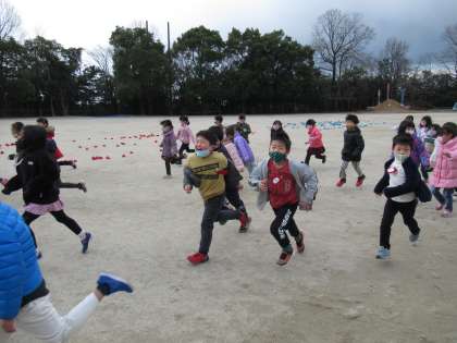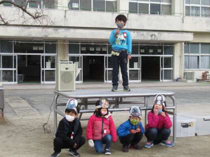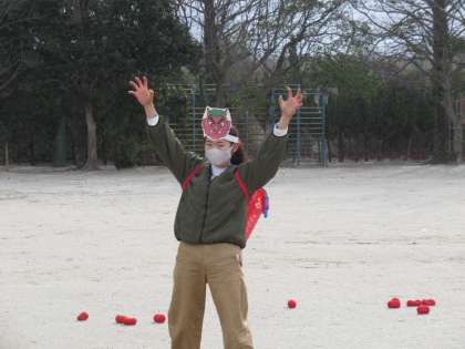 1年生が節分集会をしていました。昨日、運動場の状態が悪く、今日に延期になったのです。クイズ大会をしたあと、鬼退治をしました。豆の代わりに玉入れの玉を使い、鬼退治は鬼の背中のかごに玉を入れると、重くなって鬼がやっつけられるという鬼退治です。
