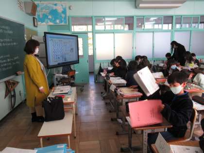 5年生の外国語科です。「Who is your hero?」の学習が進んでいます。あこがれとなる人について、その特徴を英語で表現します。何をする人か、どんな性格かなど、その人を表す英語表現に慣れ親しんでいました。