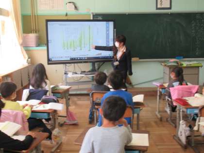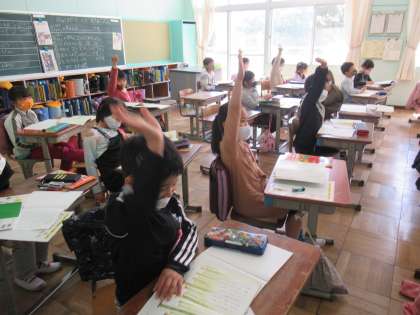 2年生の国語です。「ふきのとう」のお話の登場人物は、ふきのとう、竹のはっぱ、雪、お日さま、はるかぜ。登場人物たちのやりとりを楽しみながら、役割分担して音読していきます。
