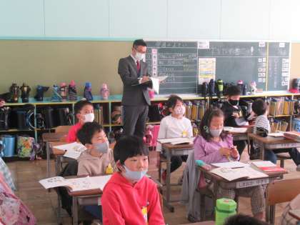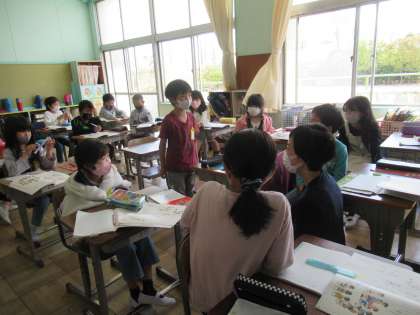 3年生の国語です。「よく聞いて、じこしょうかい」の学習をしています、前の人の自己紹介を生かし「○○が好きな△△くん後ろの、□□が好きな▽▽です。」といった話形で、どんどんと自己紹介をしていました。