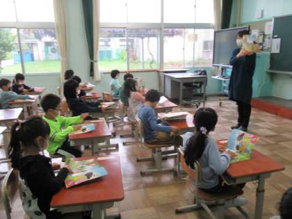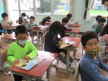 1年生の国語です。ぴかぴかの教科書を開き、「いいてんき」のきれいな挿し絵をみんなで見て、気づいたことを発表し合いました。勉強がはじまりますね。