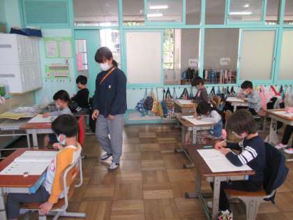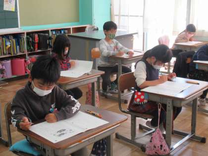 2年生の学力テストの様子です。学力テストは、「標準学力検査 教研式NRT」といい、学力を客観的に把握することができます。この結果は、これからの学習指導に役立てられます。みんな、集中していますね。