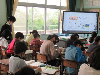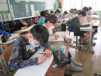 6年生の算数です。子どもたちが手元のNの図形を回していました。点対称の学習に入ったようです。6年生の1年間の学習はとてもたくさんの量があり、また高度ですが、みんな真剣そのもので、一生懸命です。