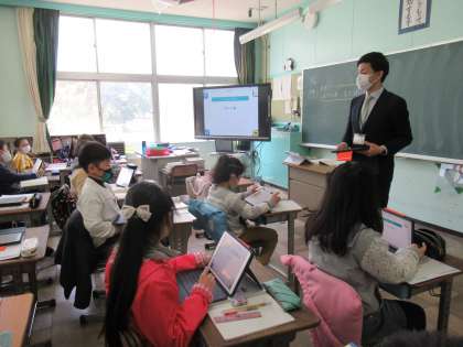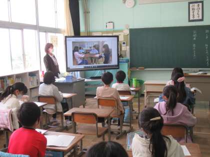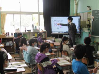 5年生の様子です。高度になってきている学習内容を見ていただきました。電子黒板やタブレットの活用の様子も見ていただくことができました。