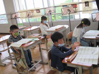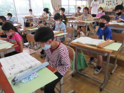 3年生の音楽です。限られた時間ですがリコーダーの練習をしています。今日は「笛星人」という曲の練習。シとラの音で作られた曲ですので、しっかりとシとラの練習ができます。まずは、曲をじっくり聞いていました。