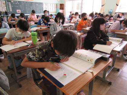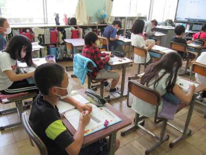 5年生の算数です。小数のわり算の学習が進んでいます。今日は「商と余り」。「24.5mのロープを5.6mずつに切ってなわとびをつくります。何本できて何m余りますか。」