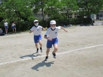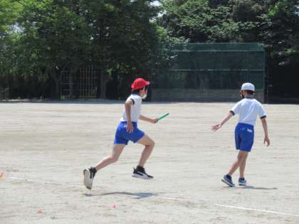 6年生の体育で、リレーの学習をしています。バトンパスをより早く正確にできるように、チーム練習をしていました。パスする側とされる側の共同作業。一回パスするごとに微調整をし、よりよりバトンバスを目指していました。