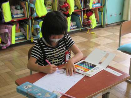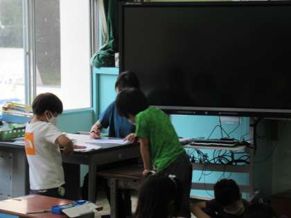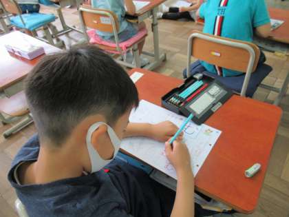 1年生の国語です。ひらがなの学習が進んでいます。今日は「む」。形が難しいですよね。先生が正しい書き方をていねいに教えてくれて、プリントで実際に書いていました。そして、書けたら静かに前に並び、順番に先生に見てもらっていました。