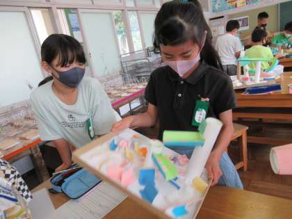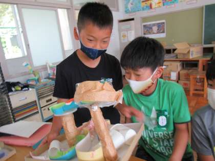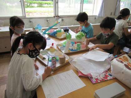 4年生の図工です。以前紹介した「コロコロガーレ」の作品が完成しました。今日は、友達の作品で実際に玉を転がして遊び、作品の良さを見つけてワークシートに記入していました。そして、自分の作品の作品カードも書き、展示できるようにしました。楽しい作品ができましたね!