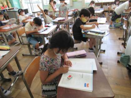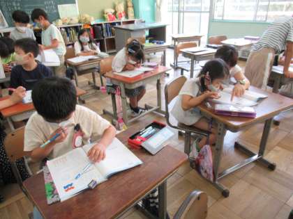 2年生の算数です。今日は「ふくしゅう」のページの問題を解いていました。1年生の内容も含めて復習をし、今後の学習の準備をします。教え合いをしながら、みんなで復習をしていました。