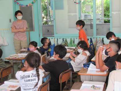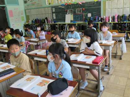 3年生の道徳です。教科書の「わたしたちの『わ』」というお話を読んで、相手を思いやることについて考えていました。車いすを使って生活しているひろみさんが、たなの上にある本に手が届かず困っている場面、ひろみさんのノートが落ちたので拾ってあげようとしたら「いいよ、自分で取るから」と言われた場面など、自分ならどんな声のかけかたをするか、じっくり考えて意見を出し合っていました。