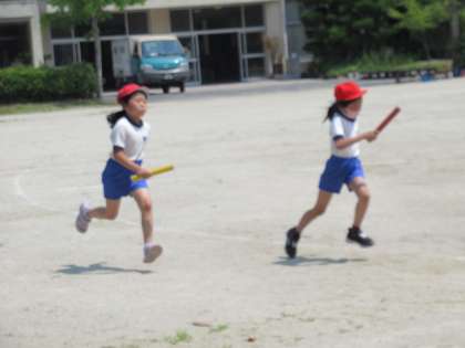 3年生の体育です。リレーの学習が進んでいます。今日は、これまで練習してきたバトンパスを意識し、実際にリレーをしていました。暑さに負けず、みんな今までの練習の成果を発揮しようとがんばっていました。