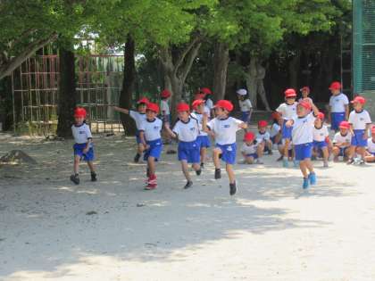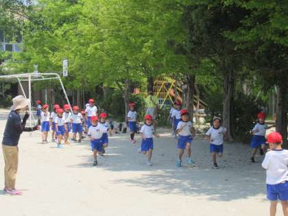 1年生の体育です。走・跳の運動遊びをしています。運動場の木陰を利用して、短い距離を走ったり、スキップしたり、頭上で手をたたきながら走ったりしていました。