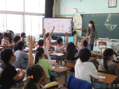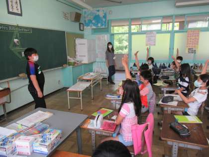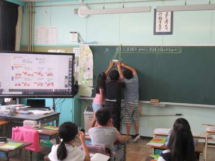 4年生の算数で、垂直な直線のかき方を学んでいました。三角定規を使って、どうやったら正確な垂直な直線がかけるか、みんなで考えていました。三角定規をしっかり固定しないと実際には正確な垂直にはなりません。しっかり押さえることの大切さを、実際に黒板の三角定規を使って確認していました。