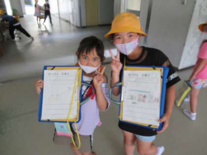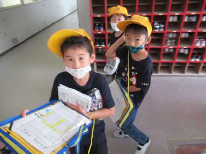 1年生の生活科です。「もっとくわしくしりたいな」の授業がどんどん進んでいます。今日は、運動場に出て、学校の遊具をくわしく見て、絵をかきました。活動から帰ってくるところしか写真を撮ることができませんでしたが、みんな満足げな顔で帰ってきました。