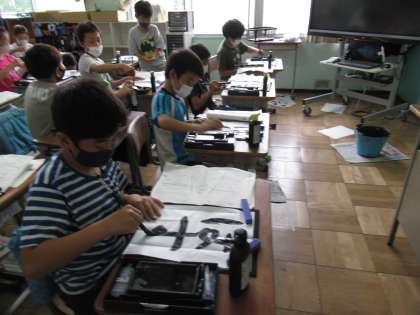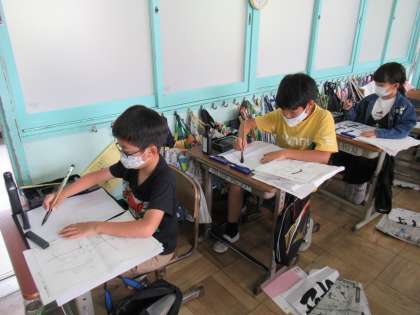 4年生の書写で、「はす」という字の練習が進んでいます。今日の目標は「結びの筆づかい」。ひらがなの「結び」の書き方は、なかなか難しいですので、先生のアドバイスやお手本を参考にして、繰り返し練習していました。