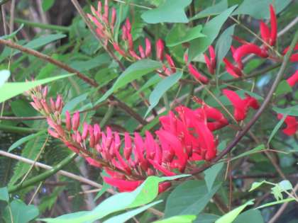 北館の校舎の裏の土手に、今年もサンゴシトウの花が咲き始めました。ちょっと不気味な燃えるような赤で、9月頃まで咲き続ける花期の長い花。マメ科の花木で、アメリガデイゴとエリスリナ・ヘルバケアとの交配種とのこと。花言葉は「夢」だそうです。