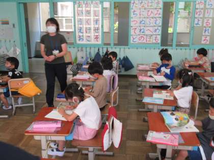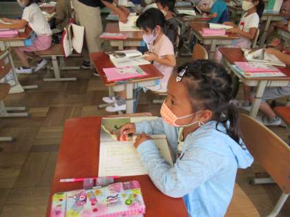 1年生の国語です。「くちばし」の学習に入りました。今日は、指で文字をなぞりながら、音読をしていました。きつつき、おうむ、はちどりといった、魅力的な鳥たちのくちばしについて説明している文章です。まずは、正確に読むことが目標です。