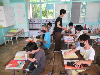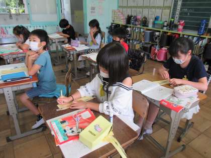 3年生の国語です。手紙の書き方について学びました。「知多の友」を使って手紙の書き方の基本を学び、封筒を作って宛名を書いていました。