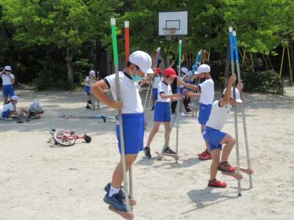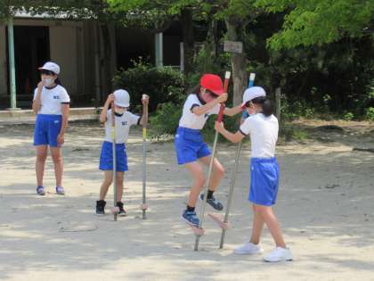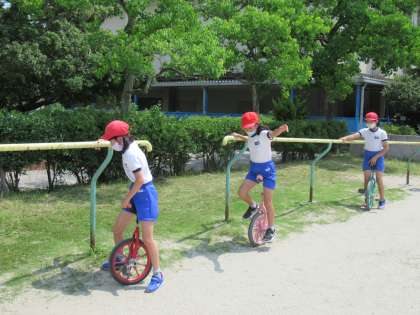 4年生の体育です。体つくり運動の一環で、竹馬と一輪車の練習をしていました。体のバランスをとる運動です。補助をうまく使いながら、体の使い方を身につけていました。