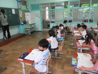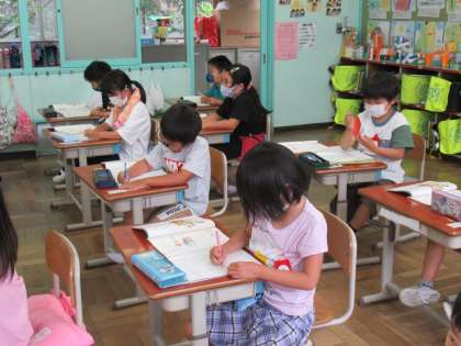 1年生の国語です。「おもちやとおもちゃ」の学習が進んでいます。小さい「ゃ」「ゅ」「ょ」、つまり拗音の勉強です。「じてんしゃ」「あくしゅ」「としょかん」・・・。実際に声に出したり書いたりしながら、正しい使い方、書き方を身につけていました。