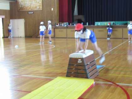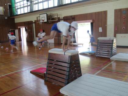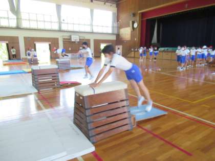 6年生の体育です。マット運動をしていました。まずは、開脚跳びの練習タイム。自分に合った練習場所で、跳び越すときの体の使い方を考えながら、繰り返し練習していました。