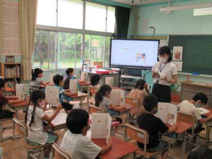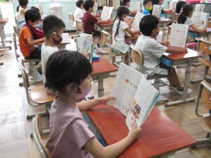 1年生の国語です。この学級でも「おもちやとおもちゃ」の学習が進んでいます。姿勢を正して音読していました。やる気が伝わってきますね。