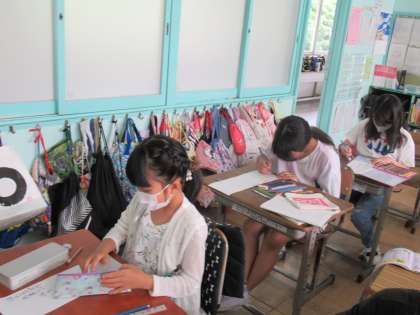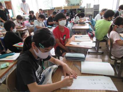 4年生の国語で、「短歌・俳句に親しもう」の学習をしています。学習のまとめとして、夏の季語を入れた俳句を自分で考えていました。七夕やホタルなどを題材に、思い思いの俳句を作っていました。作品に合う絵もかきましたので、掲示されるときが楽しみです。