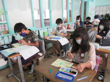 5年生の家庭科です。手縫いの「なみぬい」「本返しぬい」「半返しぬい」の練習をしていました。針に糸を通すこと、玉結び、玉どめなど、さまざまなことがセットになった活動です。数をこなして慣れることが大事ですね。