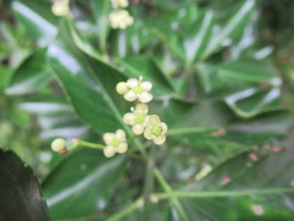 中庭のマサキ(柾)の木に、花が咲き始めました。日本全国に分布するニシキギ科の常緑樹。丈夫で刈り込みに強いため、かつては垣根によく利用されていたそうです。マサキという名前の由来は諸説ありますが、「冬でも葉が真っ青な木=真青木」とのことです。