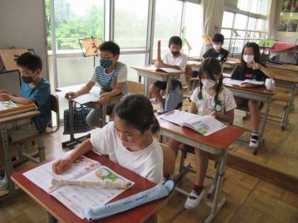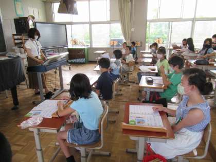 4年生の音楽です。先生がドレミの歌の伴奏を演奏しだすと、思わず子どもたちは歌い出してしまいますが、今日はリコーダーで演奏します。まず、楽譜を見て、どう演奏するか確認していました。
