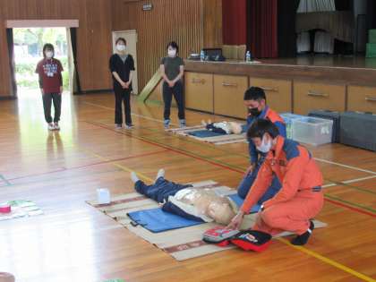 児童の下校後、すべての教員が体育館に入り、心肺蘇生法とAED、エピペンについて学びました。知多消防署八幡出張所から2名の救急救命士に来ていただき、ソーシャルディスタンスを保ち、グループでなく個別に練習できるグッズを使って心肺蘇生、AEDの訓練をしました。基本的に毎年訓練をしていますが、コロナ禍ならではの注意点も教えていただき、あらためて命を守る方法を確認できました。今日学んだことが、必要ないまま毎日過ぎるのが一番なのですが、いざというときのための大切な研修をすることができました。