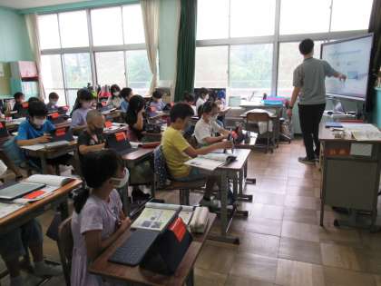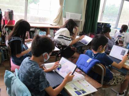 5年生の理科です。台風について調べていました。タイムリーな学習ですね。教科書やウェブ上の天気図をもとに、台風が近づいたときの天気の変化について調べていました。