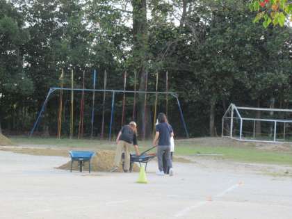 子どもたちの下校後、先生たちは運動場の整備を行いました。低くなっているところを中心に、新たに土を入れ、気持ちよく運動会ができるようにしました。
