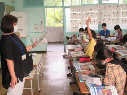 6年生の外国語の授業です。海、山、砂漠などに住んでいる生き物の暮らしぶりを英語で表現します。どこに住んでいて、何を食べるのかを聞きあう表現も身につけます。