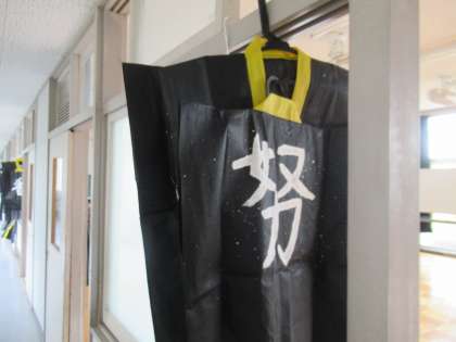 6年生の運動会の学年種目の衣装ができあがったようです。一人一人が自分の好きな漢字を大きく書きました。