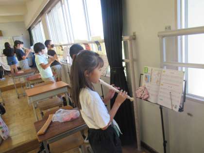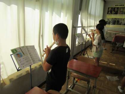 4年生の音楽です。リコーダーで「くちぶえ」という曲の練習をしていました。今は感染症対策をとりながら、リコーダーの練習を進めています。