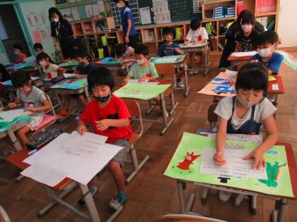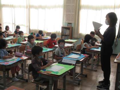 1年生の図工で、物語の中の印象的な場面を絵にする「おはなしからうまれたよ」。絵が完成しましたので、友達と作品を見合って、友達の作品のいいところを見つけます。鑑賞カードが配られ、活動の流れを確認していました。