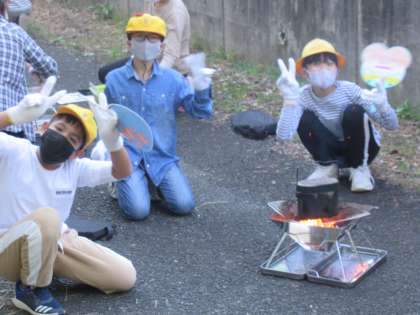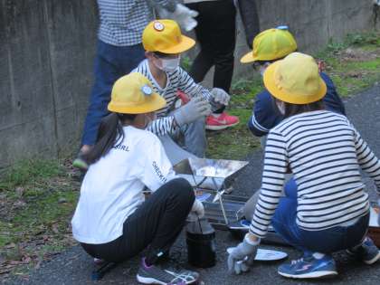 今日もいい天気になりましたので、飯ごう炊さん体験が実施できました。今日は、食べるところではなく、飯ごうや焚き火台の準備、そして火の管理をしている様子を紹介します。当然ながら、慣れていない子が多いので、先生に教えたもらったことを思い出しながら慎重に進めていました。仲間と協力してる様子、楽しそうでした。