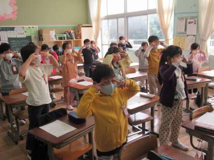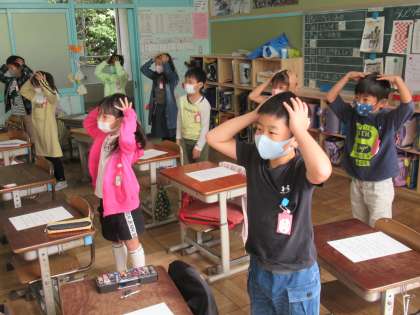 2年生が、3年生からの外国語活動に向けて、ALTの先生と外国語に親しむ活動をしていました。体を表すさまざまな英語表現がまるごと歌詞に入っている歌を聞きながら、振り付けをつけて楽しんでいました。