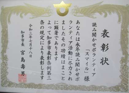 なお、本年度、スマイルさんの長年にわたる活動に対して市長から表彰されました。感謝の気持ちを込めて、学校に掲示させていただきます。