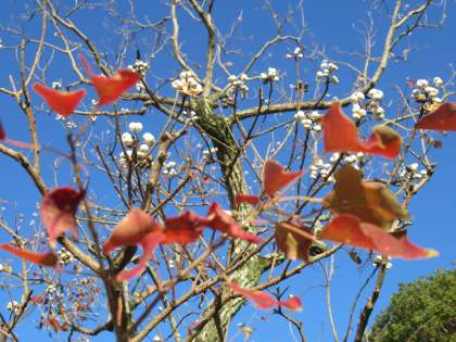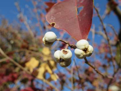 校庭のナンキンハゼの実がはぜて、まるで白い花を咲かせたように、あるいは雪がちらついているかのようになっています。「果皮が裂開して種子を出した状態」だそうです。