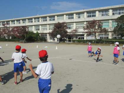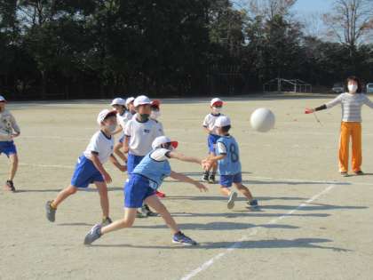 2年生の体育で、ボールを使ったゲームの授業として、ドッジボールをしていました。王様役がいる、ひと工夫加えたドッジボール。楽しみながら、投げる動きを中心にした運動を進めています。