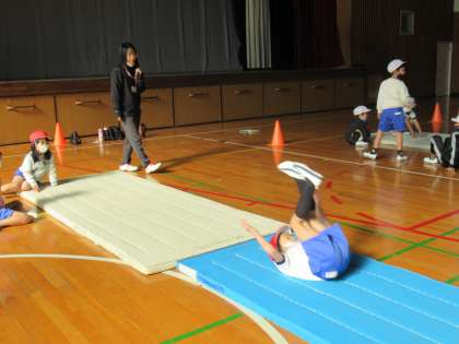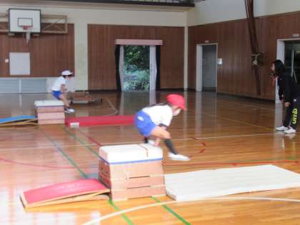 1年生の体育で、マットや跳び箱を使っての運動遊びの学習が進んでいます。はりきって何度も練習している様子が微笑ましいです。公開日では、きっと学習の成果を発表できることと思います。