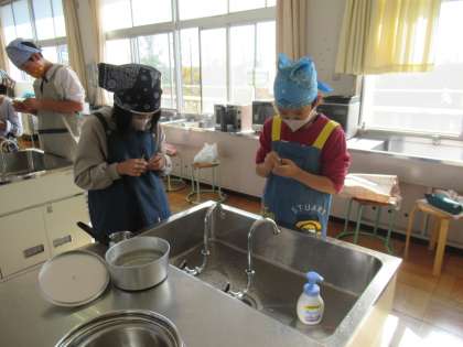 5年生の家庭科、「食べて元気!ごはんとみそ汁」の調理実習の様子です。人数を減らして実施しています。今日は、だしとなるにぼしの頭とはらわたを取り除いている様子を紹介します。学校では、教科書通りの作り方を学びますが、各家庭ごとに違いがあるのがみそ汁ですよね。