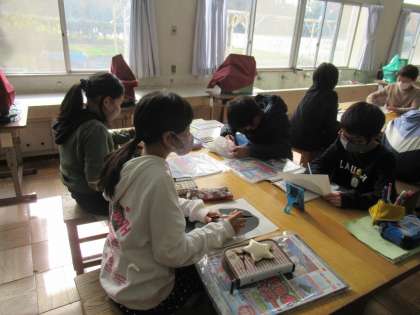 5年生の図工で、版画の学習に入りました。自分の顔を版画にするということで、今日は印刷した写真を参考にして、下絵をかいていました。どこを彫るか考えながら下絵をかいていくのは、頭を使う活動ですね。