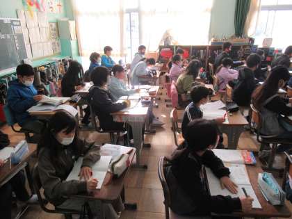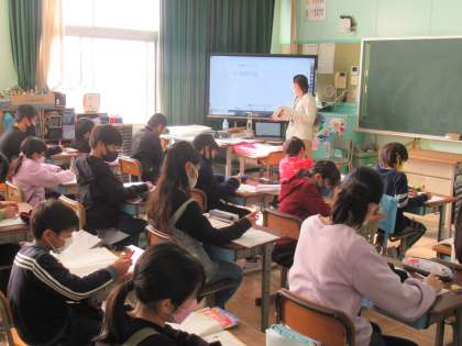 4年生の算数で、「小数のかけ算やわり算」の学習が進み、今日は「学びのまとめ」のページの問題を自力で解いて、学習のまとめをしていました。答え合わせをして、間違いがあれば、正しい解き方を再確認します。